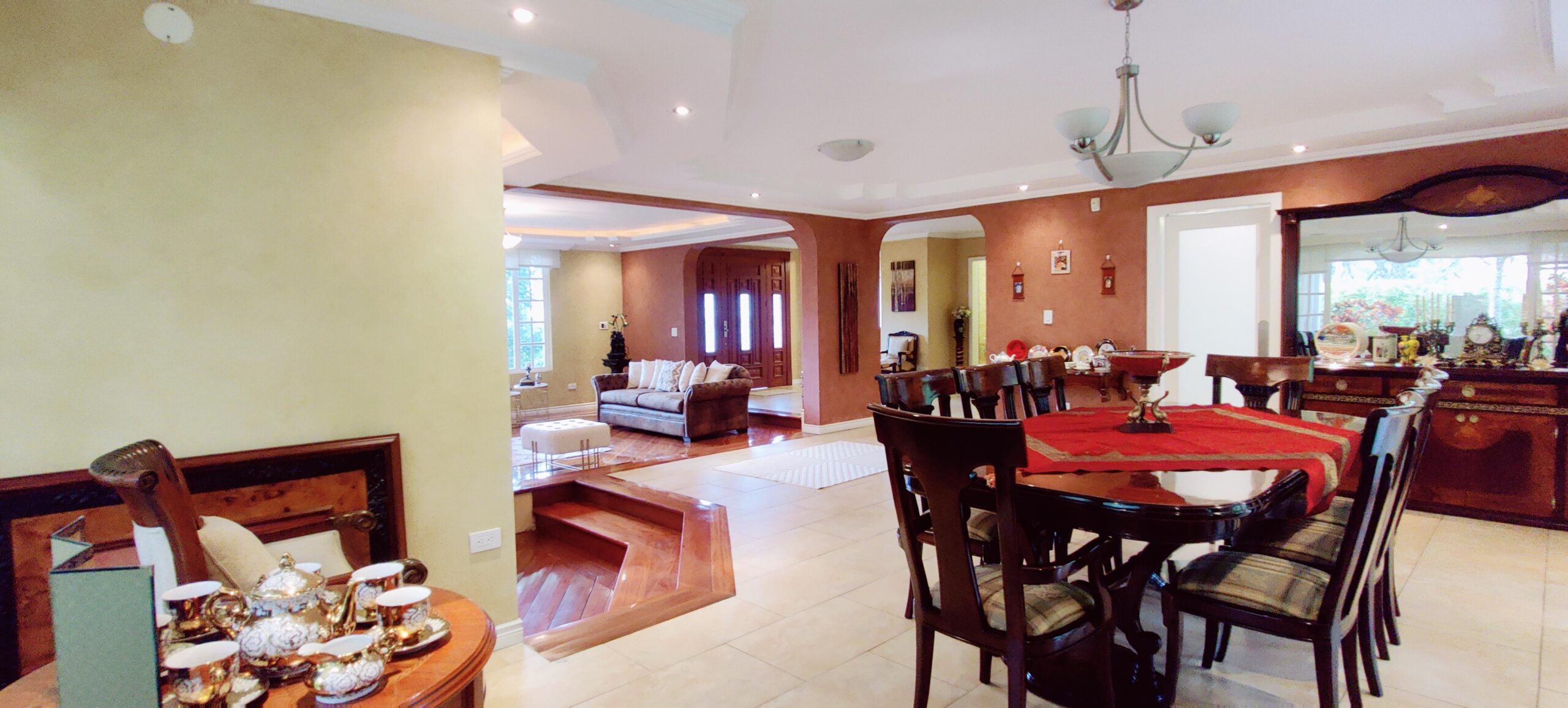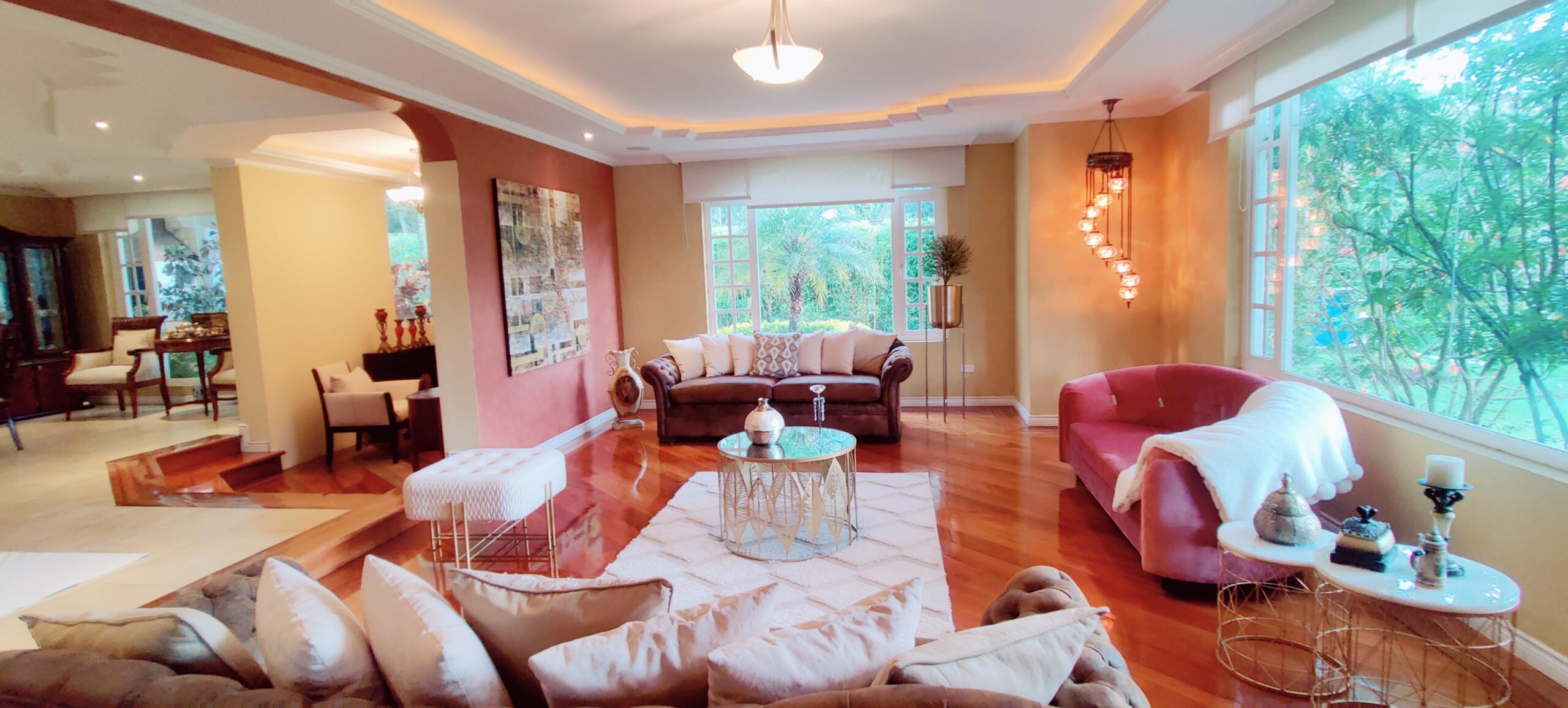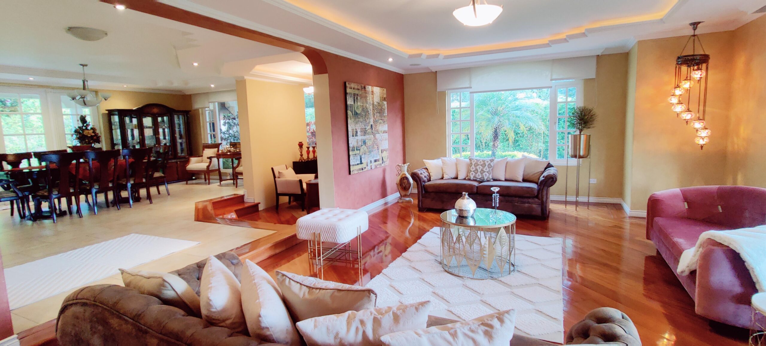 Amplia sala principal y comedor con salida a porche cubierto con BBQ y amplio jardín con árboles