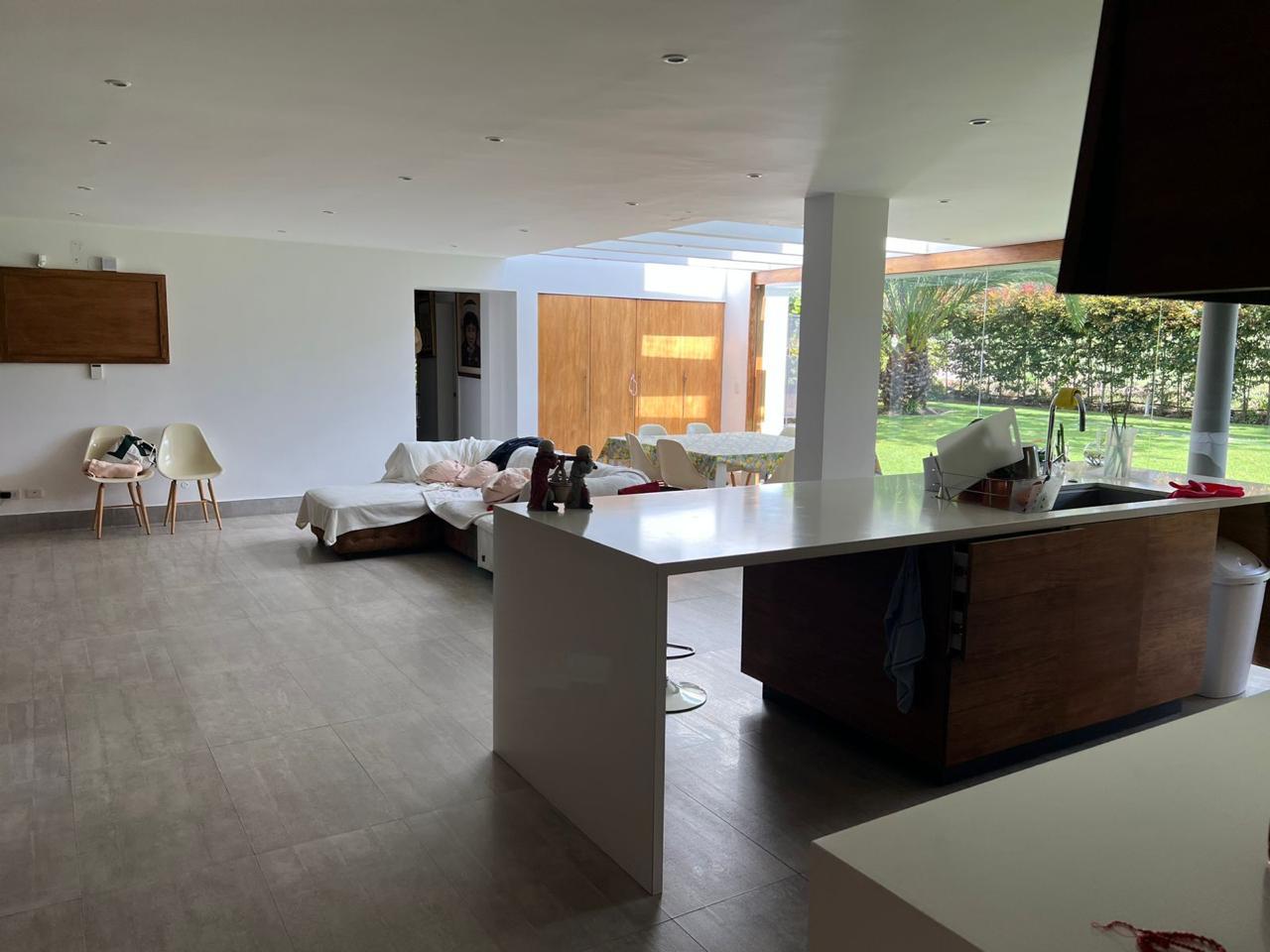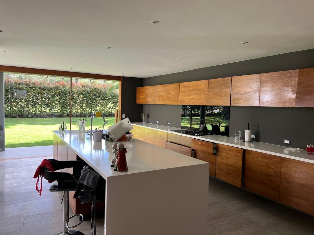 La cocina, moderna y de estilo americano, está equipada con mesones de cuarzo y tiene acceso directo al porche, ideal para disfrutar de reuniones familiares. Además, cuenta con cuarto de máquinas y un cuarto de servicio con baño propio.